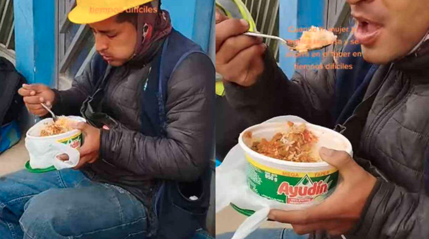 En el video se puede ver como el obrero de construcción está comiendo sentado en un escalón y sosteniendo su tupper color blanco con verde, mismo que está envuelto en una bolsa de plástico blanca.