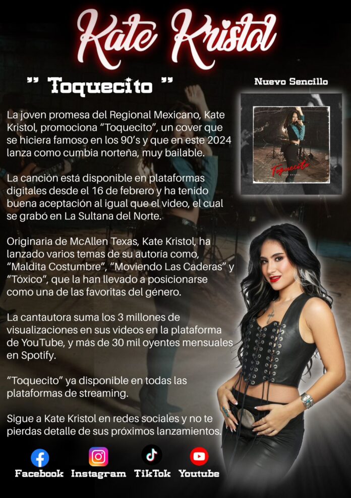 La joven promesa del Regional Mexicano, Kate Kristol, promociona “Toquecito”, un cover que se hizo famoso en los 90’s y que en este 2024 lanza como cumbia norteña, muy bailable.